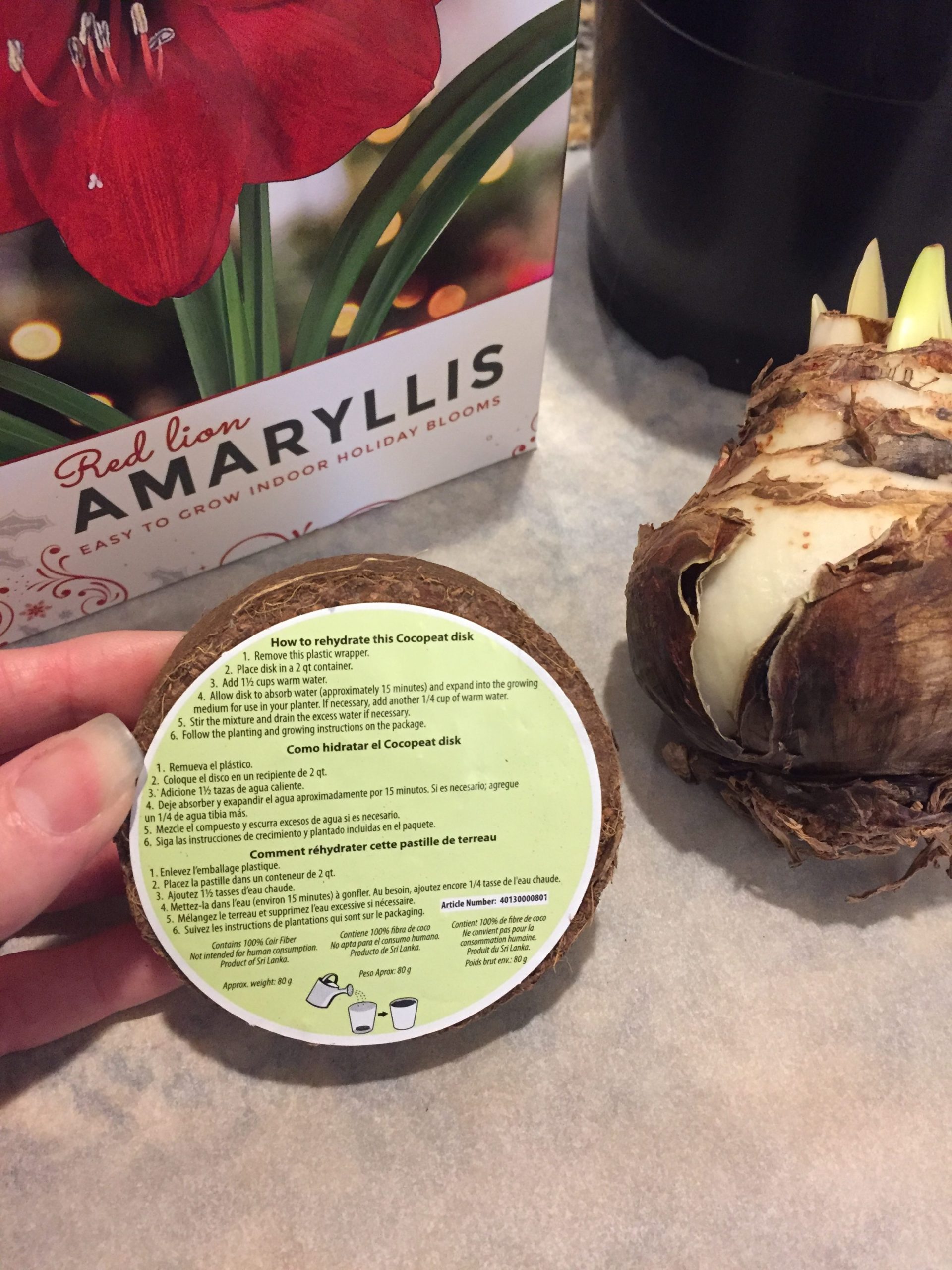 Instructions for rehydrating a coconut fiber peat puck for planting an Amaryllis bulb