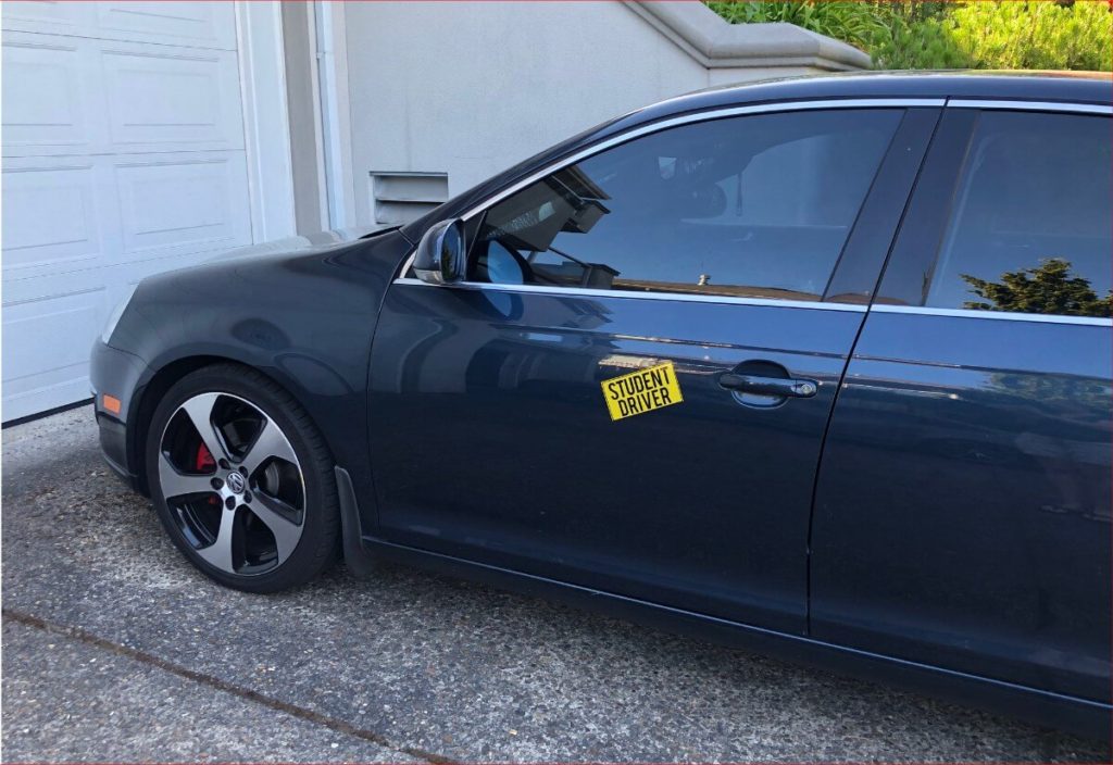 You probably don’t need a “cheese wedge” for the top of your vehicle like they have on the cars for driver training, a simple magnet or window sign is just as effective without totally embarrassing your teen. Having a student driver magnet, decal, or sign in the rear window (if it doesn’t block their view) is very handy.