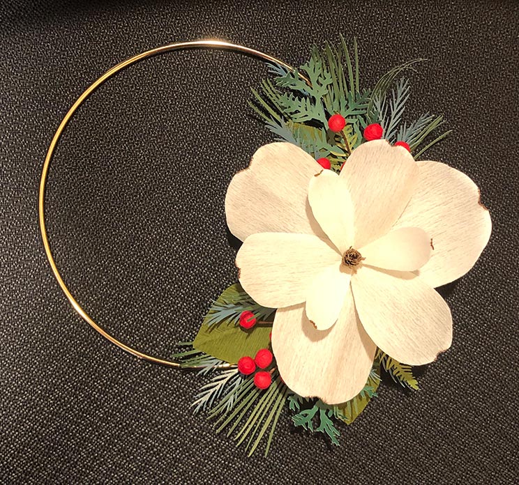 I got the cut files and instructions for the magnolia wreath at the Holiday Maker Fest hosted by Jennifer Maker. The classes are still available (at least they are at the time of writing this) but you have to purchase the VIP All Access Pass to get it. Here is a link if you would like to see if it is right for you.