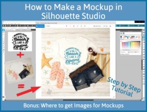 An image of a cut file and an image of a t shirt with a beach theme mockup to the left of a finished mockup in silhouette studio
