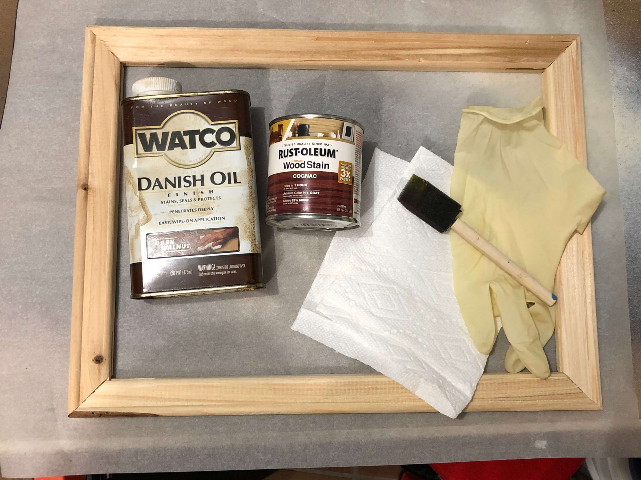 Wood stain, foam brus, cloth, gloves, wood frame used to make reverse canvas project