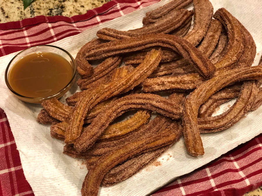 Pumpkin spice churros with caramel dipping sauce