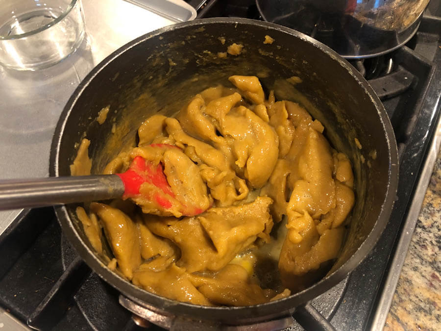 A skin or crust of the paste will form on the pot when you are cooking and stirring the paste.