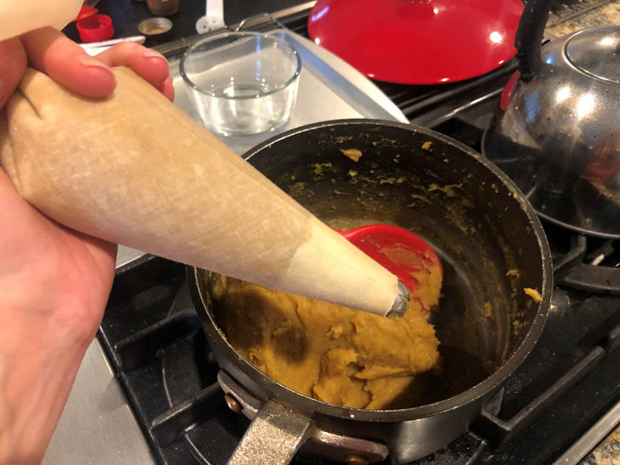- Put the piping tip into the piping bag and fill the piping bag with about 1/3 of the paste and twist the bag closed.