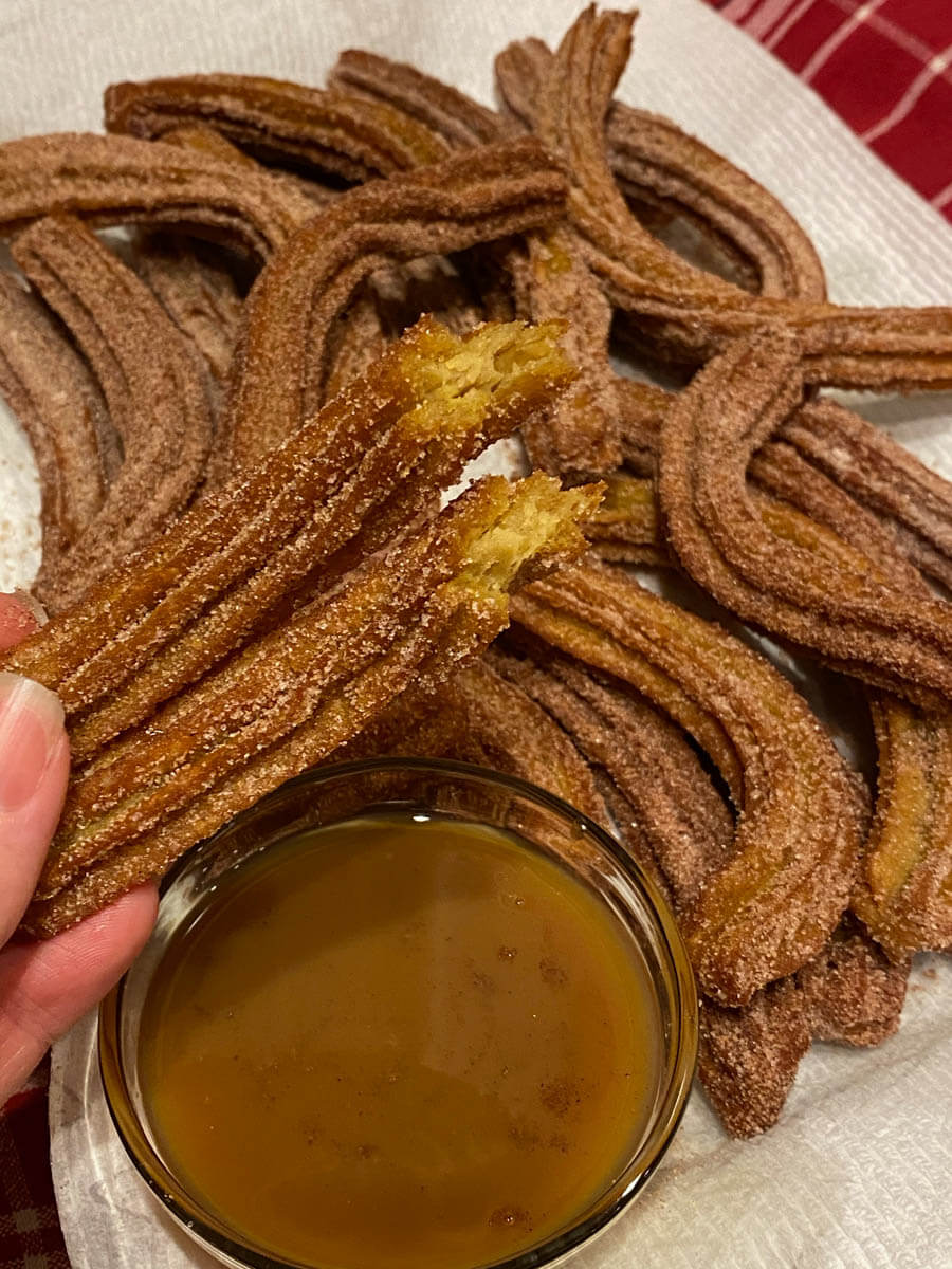 I used an Ateco 825 large star tip which has about 1/2″ opening. It has long points which made nice big ridges in the paste which fries up with crispy ridges and a smaller center. This set of Ateco tips has a good selection of large tips. The 827 or 846 will give you nice sized churros. Or you can get just the single 846 star tip.