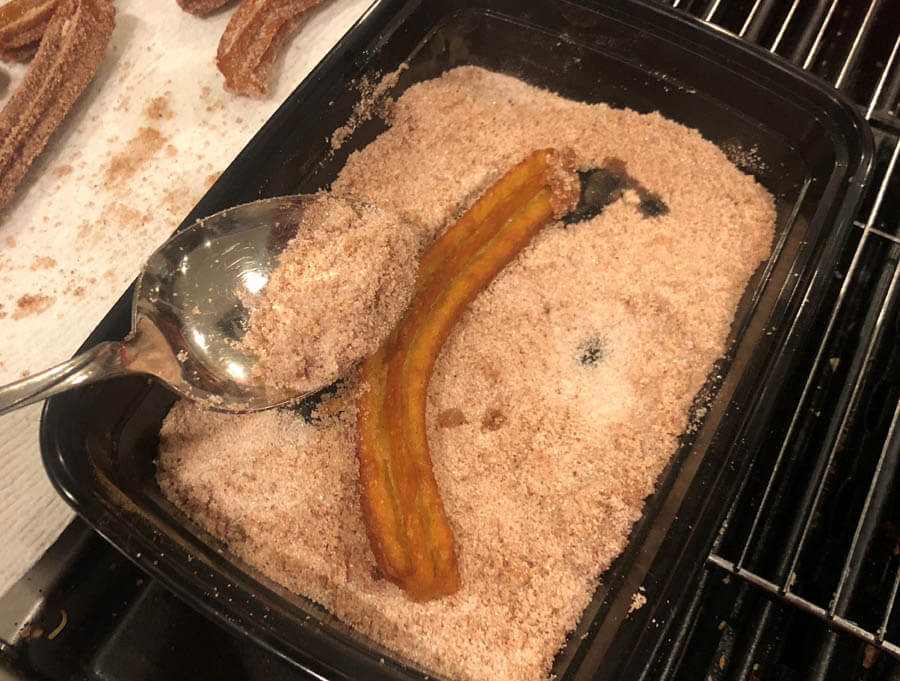 - Remove the churro from the oil and place in the pumpkin spiced sugar. Spoon the sugar to completely coat the churro.