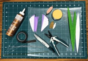 Supplies needed for making crepe paper flowers including glue, crepe paper, pattern pieces, scissors, wire, panpastels, and floral tape