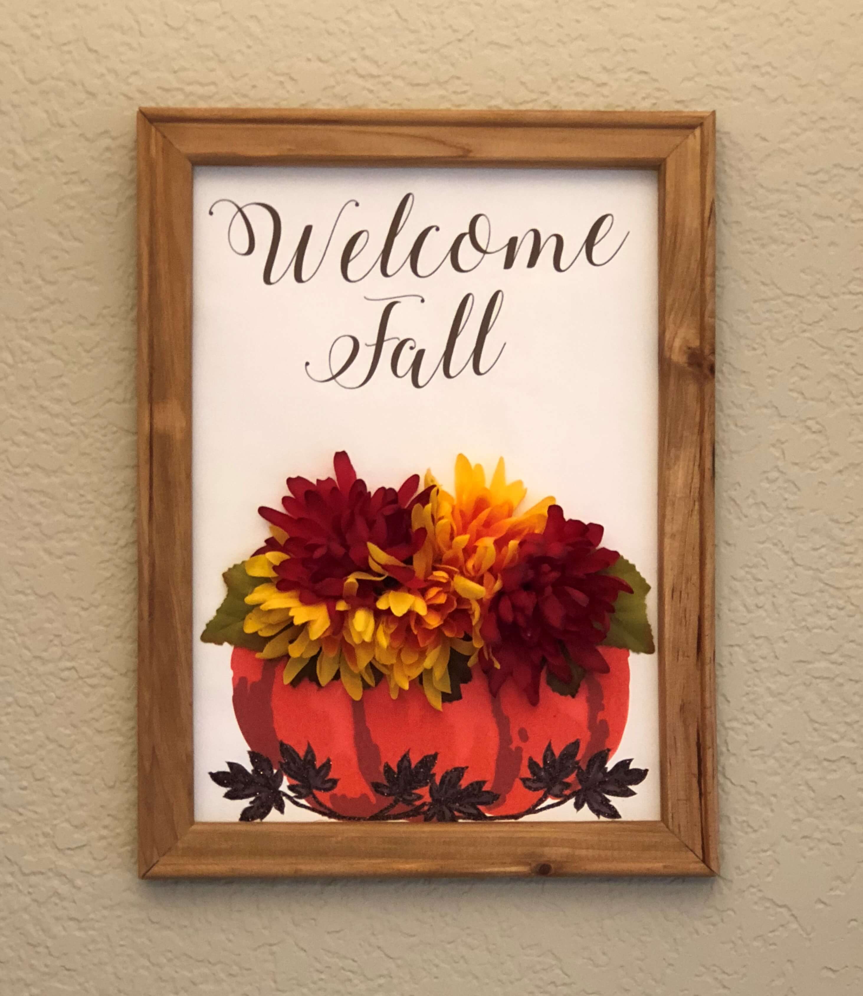 Finished projece, Welcome Fall embellished reverse canvas using free SVG cut file by Little Gray Squirrel