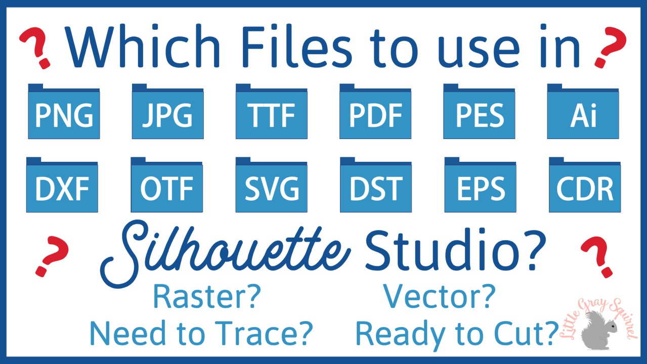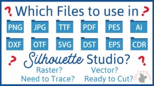 Which files to use in Silhouette Studio shows what file type you should use that have cut lines and which ones you can use that don’t including png, jpg, bmp, tif, svg, dxf, eps, cdr, and more.